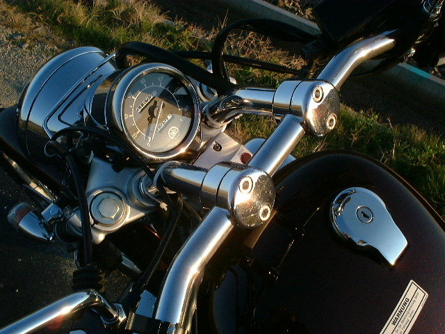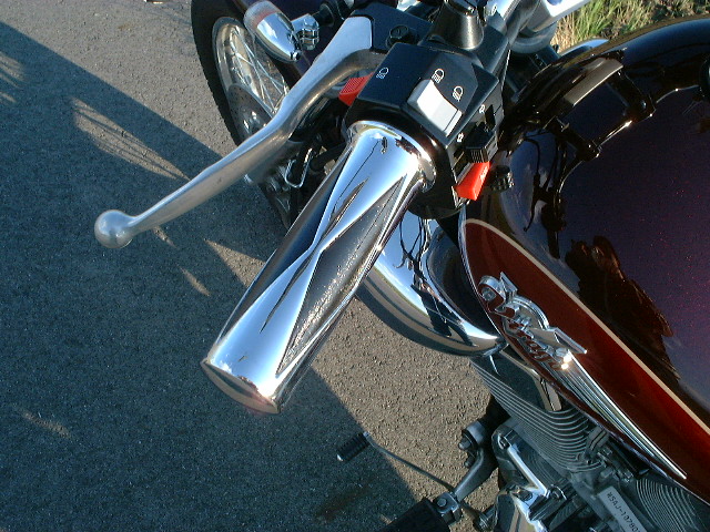 純正のグリップは細タイプだったので、アメリカンらしくしてみました。 |