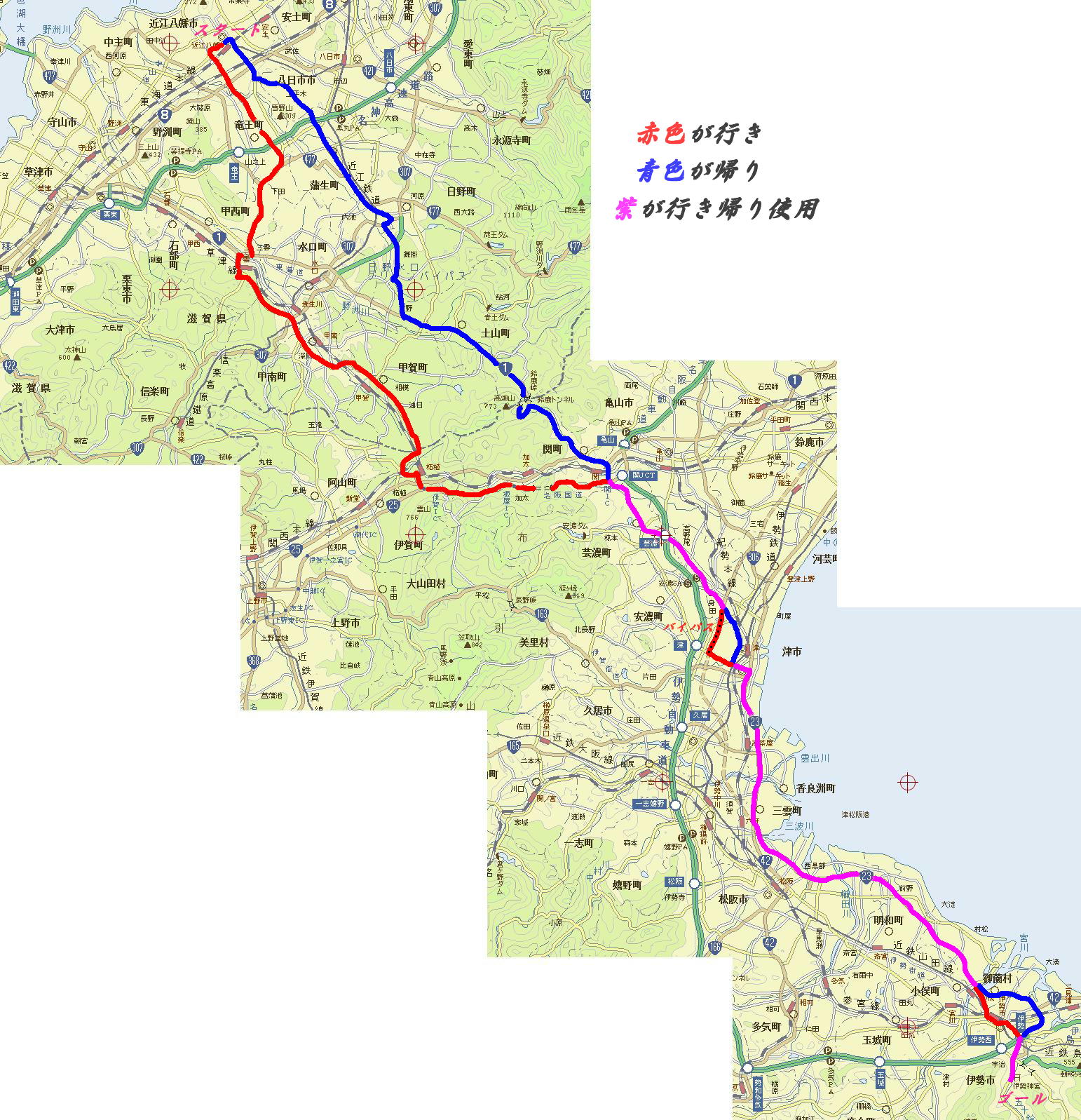 「関町」→国道1号線→「土山町」→国道1号線→「水口町」→「甲西町」→「竜王町」→帰宅。