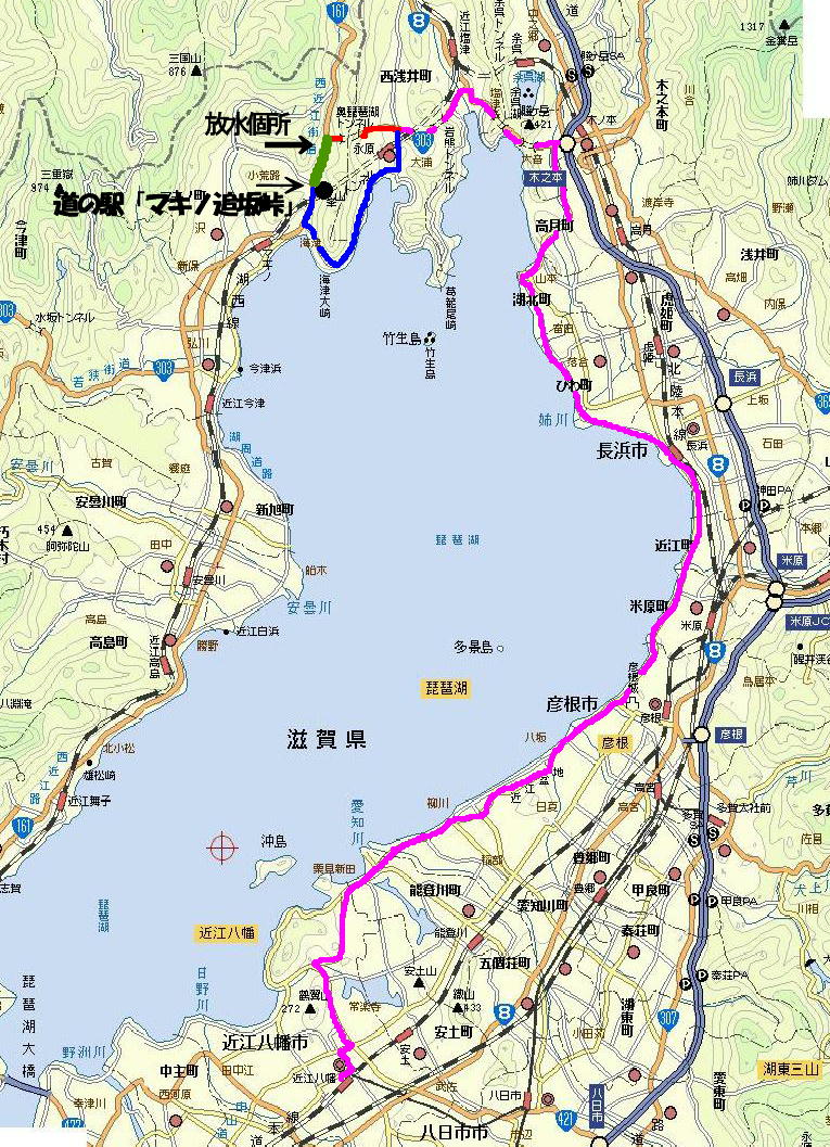 「道の駅・マキノ追坂峠」→海津大崎→西浅井町→(国道8号線)→木之本町→(湖岸道路)→長浜市→彦根市→帰宅