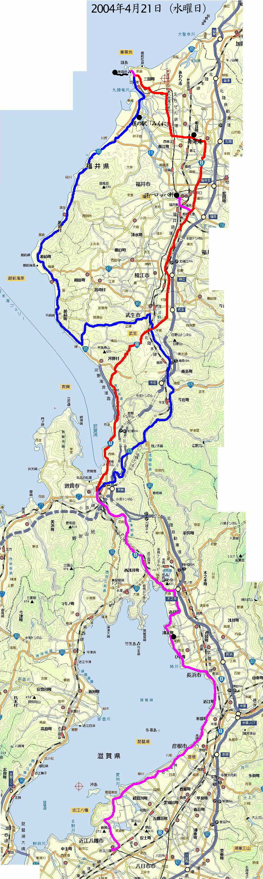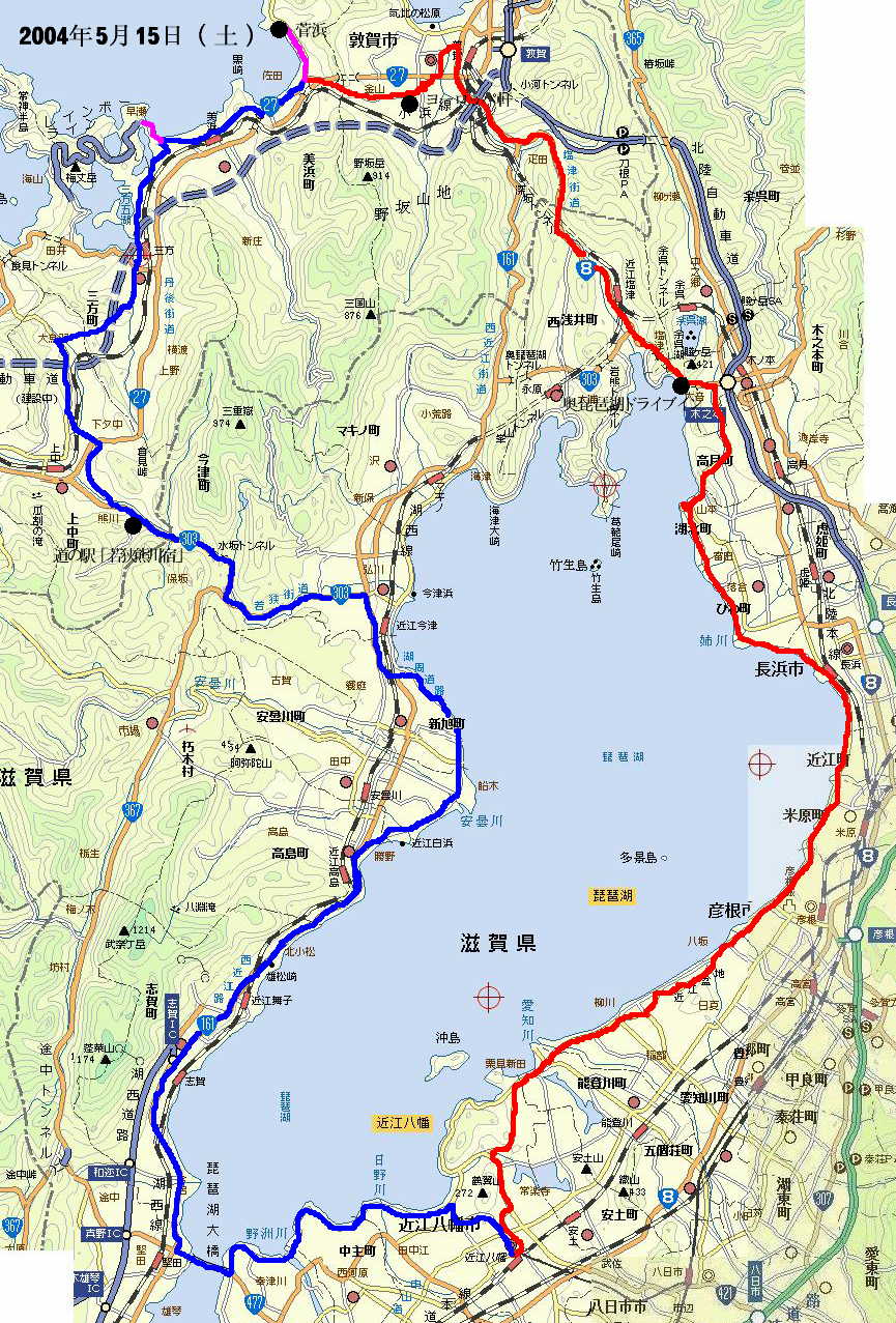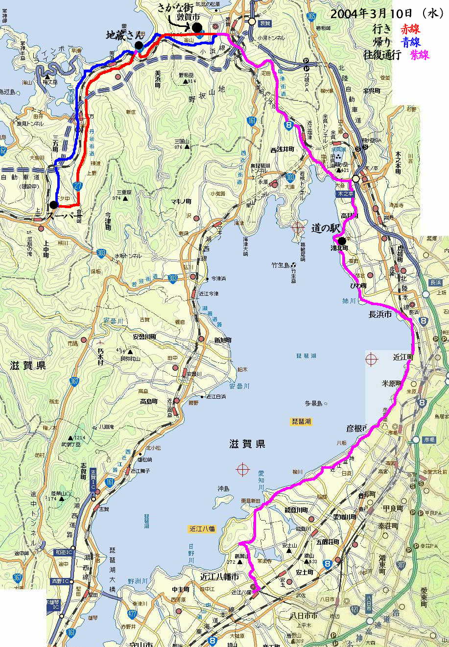 ルート:自宅→(湖岸道路)→彦根市→米原町→長浜市→びわ町→湖北町→高月町→木之本町→(国道8号線)→敦賀市→(国道27号線)→美浜町→三方町→上中町→(梅街道)→三方町→美浜町→敦賀市→木之本町→湖北町→長浜市→彦根市→帰宅