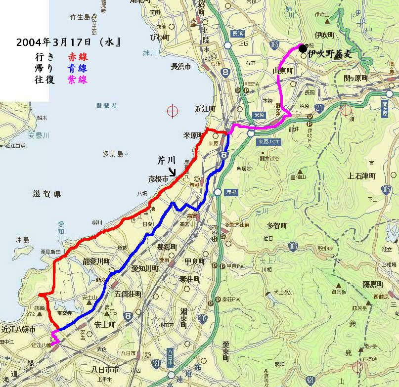 ルート:自宅→(湖岸道路)→彦根市→米原町→(国道8号線)→近江町→(国道21号線)→山東町→伊吹町→目的地→山東町→米原町→(国道8号線)→彦根市→帰宅