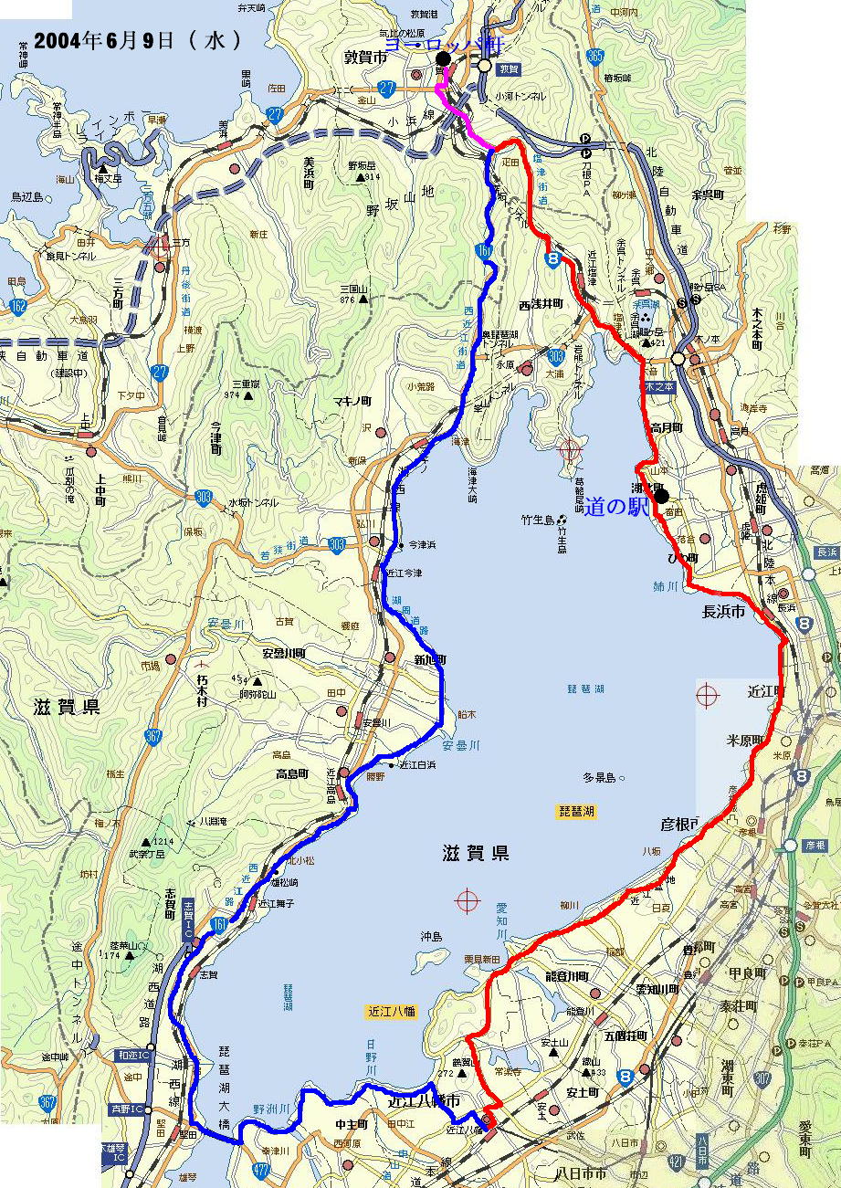 西浅井町→マキノ町→(湖岸道路)→今津町→新旭町→高島町→(161号線)→志賀町→大津市→(琵琶湖大橋)→(琵琶湖湖岸道路)→守山市→中主町→帰宅