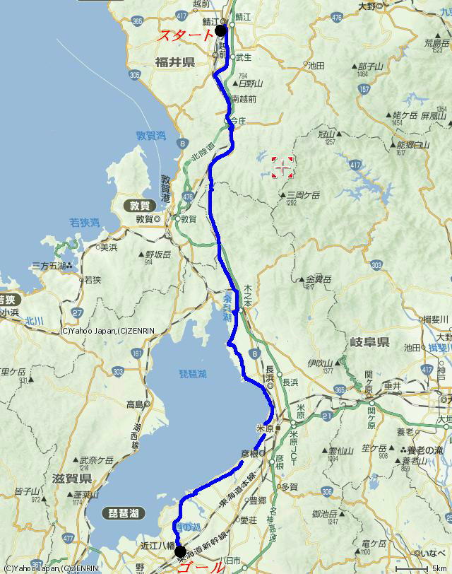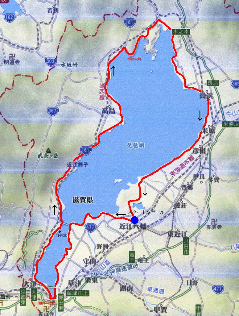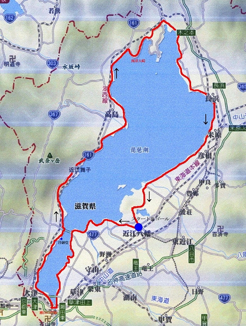 自宅→(湖岸道路)→守山市→大津市→(瀬田の唐橋)→浜大津→(国道161号線)→大津市堅田→(浮御堂)→高島市→(湖岸道路)→今津町→