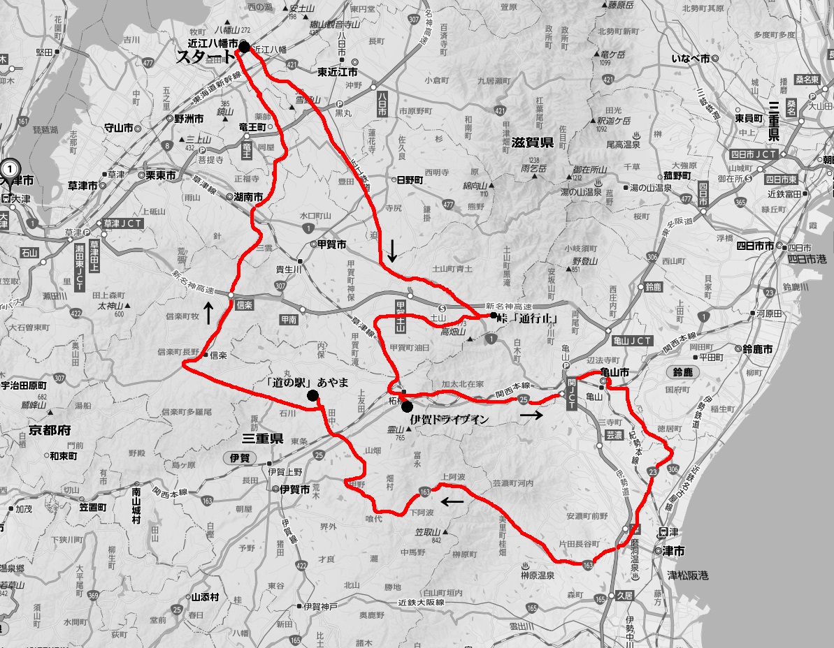 出発:10時 日野町軽油で国道1号線へ。 国道1号線、鈴鹿峠を越える手前「山中交差点」を左折。 「歴史の道」と言われる「安楽峠越え」を目指しましたが、落石防止工事ために通行止めとなっていました。 今月末には作業が終了するみたいなので改めて行きたいと思います。 再び国道1号線に出て三重県の伊賀市方面へ。 「鹿深の道」と言われている道を走行。2車線で幅がある峠越え。 途中「神」と書かれている地名もあったりと知らない道を走るのは楽しい。 県道4号線(草津伊賀線)に出てからは、いつも使っているルートで伊賀ドライブインへ。 ちょうど昼だったので食事タイム。 いろいろなメニューがあり迷ってしまう。 今回、ミックス丼を注文(海老天&とんかつの丼物) 食後、ソフトクリーム・・・300円也 国道25号線の旧道を走行。車は殆ど走っていない。 狭くて道が悪く、一部はダートになっている。 国道1号線に出ると鈴鹿市方面へ 亀山市付近で右折。 市内に入ってしまった。 亀山東小学校? 商店街・・・ どこを走っているのか? しばらく走ると国道306号線に出た。 気持ちよく走れる。 中勢バイパスに入る。 津市に入ったところで163号線に! 163号は以前に走っているが、伊賀上野市方面に向かう峠は初めて。 余り幅は無いが2車線の道路。 ワインディングが楽しめる。 新しくできたトンネル。 寒かったよ〜〜 名阪国道「壬生野IC」の下をくぐり、道の駅「あやま」へ。 休憩(コーヒータイム)。 少し遠回りして信楽町へ。 国道422号線は気持ちいい道路。(お気に入り) 国道307号線に入り。 水口町経由で竜王町へ。 自宅近くのガソリンスタンドで給油。 連休なので明日用! 帰宅:16時14分