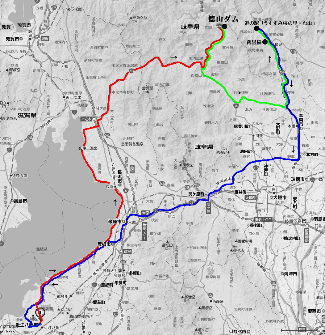 <ルート> 自宅→(湖岸道路)→東近江市→彦根市→米原市→長浜市→高月町→(国道8号線)→木之本町→ (国道303号線)→道の駅「夜叉ケ池の里さかうち」→横山ダム→(国道417号線)→徳山ダム(散策)→ (国道417号線)→(国道303号線)→久瀬村→(県道40号線)→(国道157号線)→ 道の駅「うずずみ桜の里・ねお」(昼食)→薄墨桜→(国道157号線)→本巣市→(県道23号線)→ (県道53合線)→神戸町→池田町→道の駅「池田温泉」→関ヶ原町→(国道21号線)→米原市→ (国道8号線)→(米原彦根線)→彦根市→(琵琶湖湖岸道路)→東近江市→加茂町(給油)→帰宅 <データー> 走行距離:288.1km 燃費:約27.7km/L 天気:快晴 気温:12〜24度 朝昼の温度差アリ ガソリン(1L):161円(ハイオク) 使用バイク:XL883N ILON