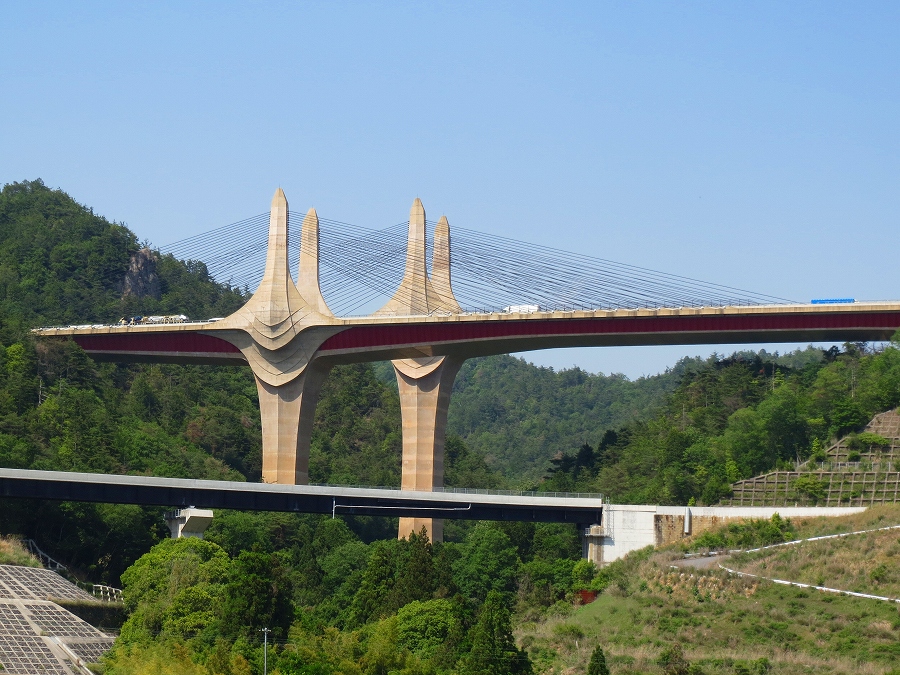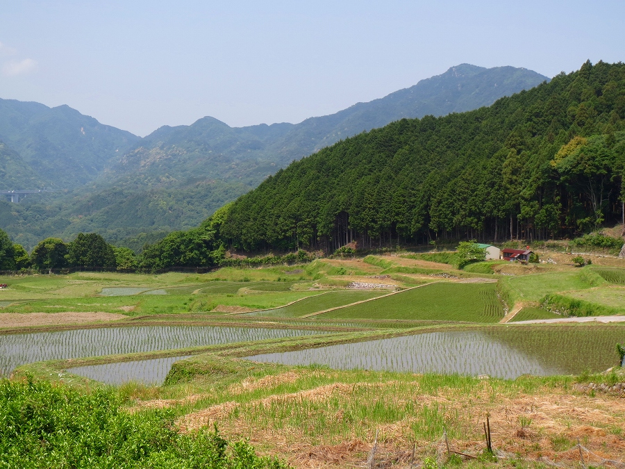 石水渓に入ると川は花崗岩(かこうがん)がゴロゴロしていてとても綺麗。 峠の終わる頃には、新名神の高架がドンと目に入る。 亀山市に入った。 「坂本の棚田」の標識!「棚田百選」らしい。 道を外れて坂道を上る。 長閑な田園風景が広がる所。 全体を見渡せる場所には休憩場所が設けられていた。 秋に来たら綺麗だろうな。