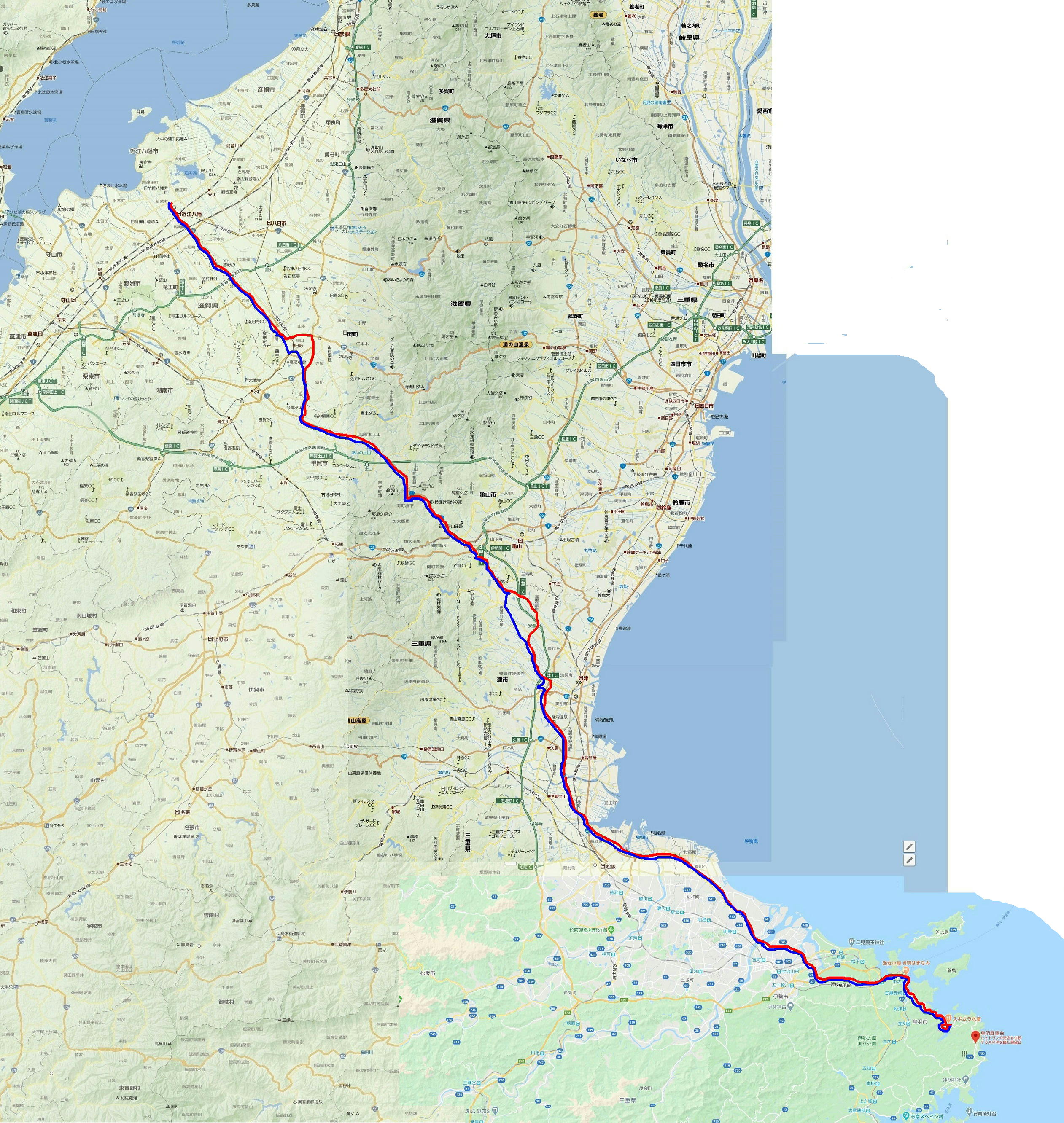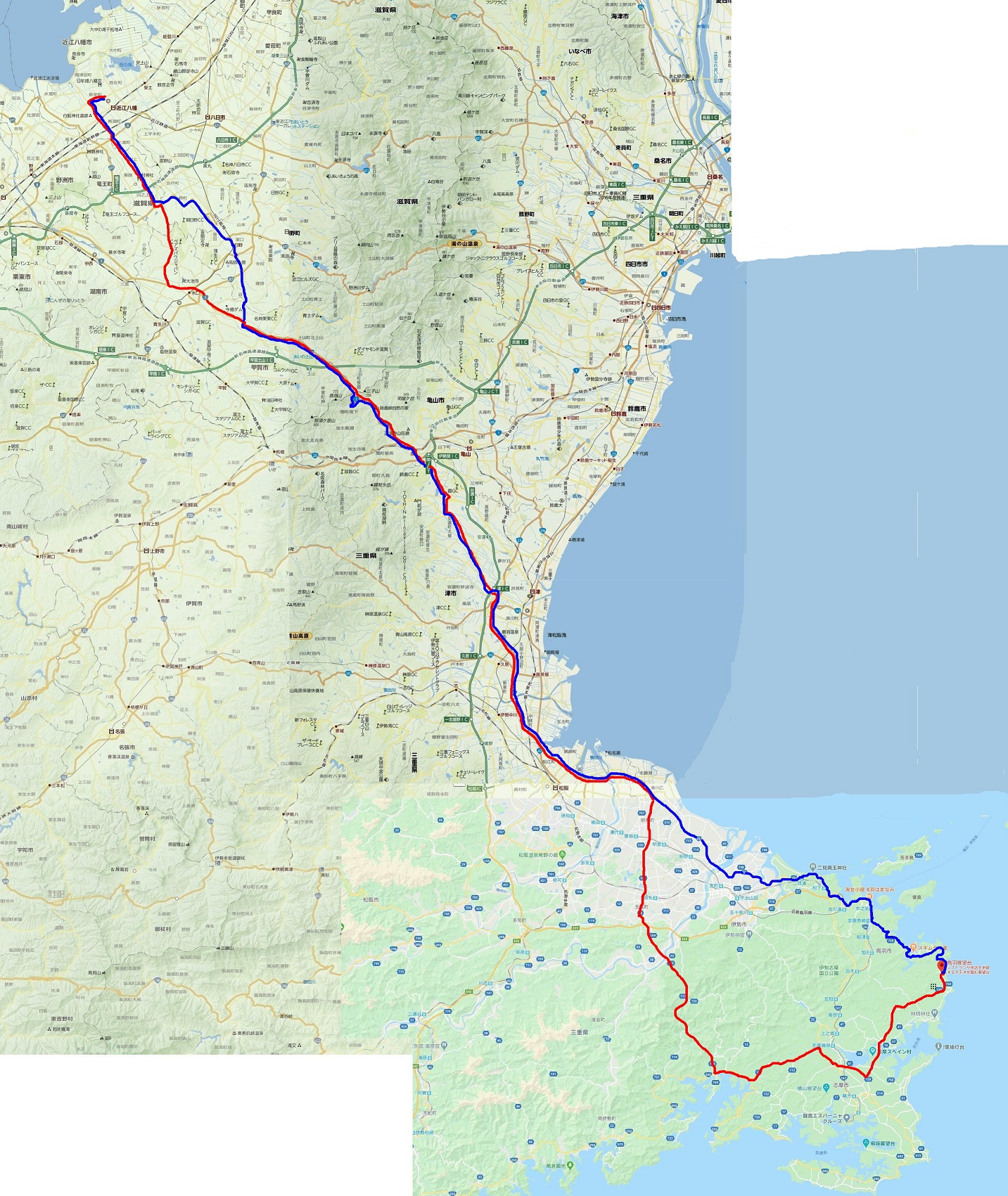 (中勢バイパス)→松阪市→(国道23号線)→明和町→伊勢市→鳥羽市→浦村(朝食)→鳥羽市→