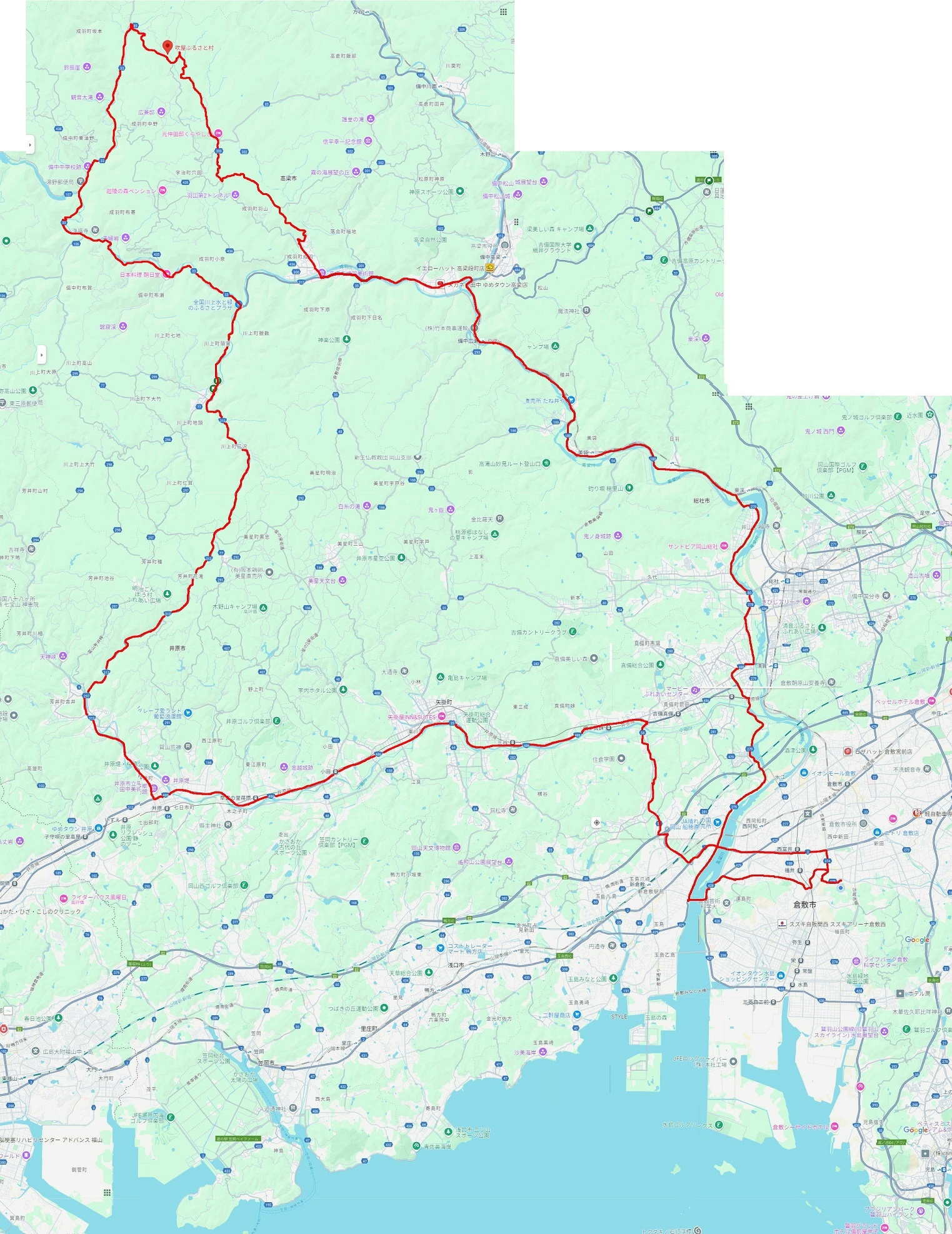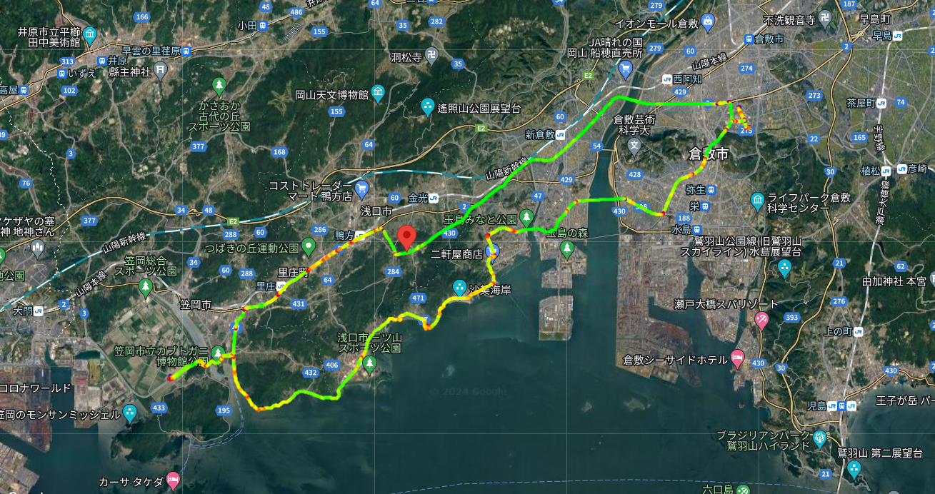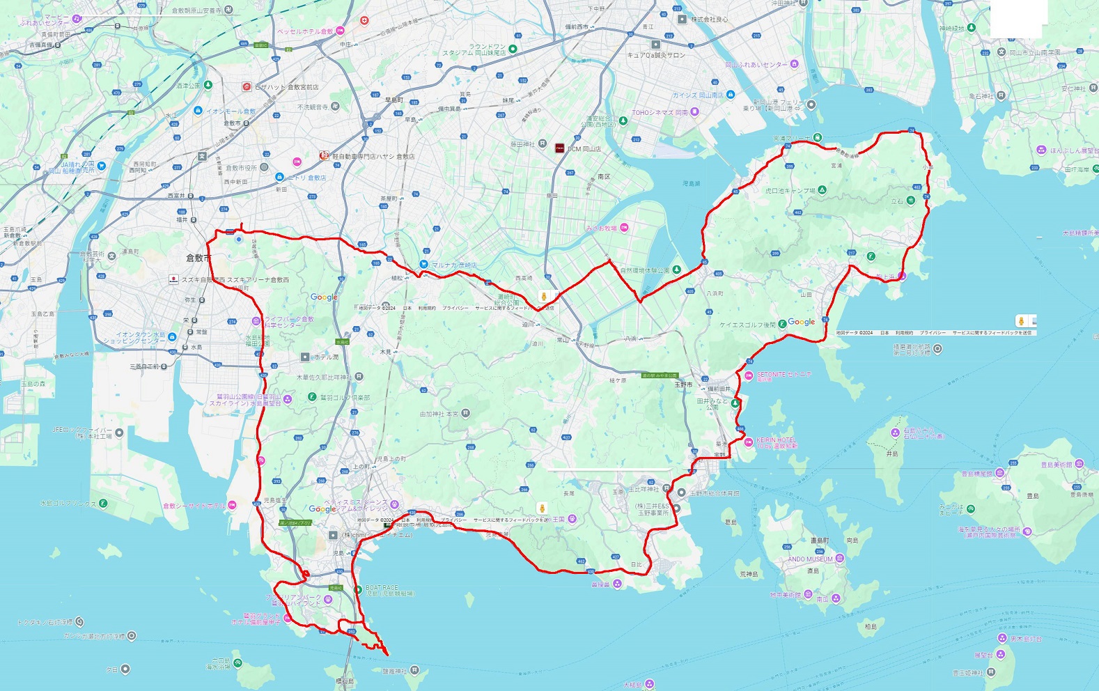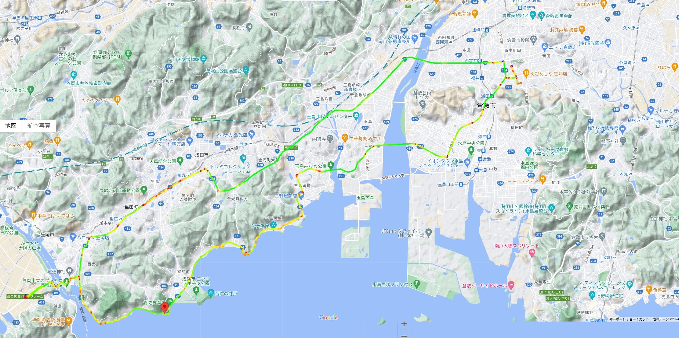 自宅→ガソリンスタンド→(藤戸連島線)→(県道275号線)→(県道22号線)→(ショートカット)→