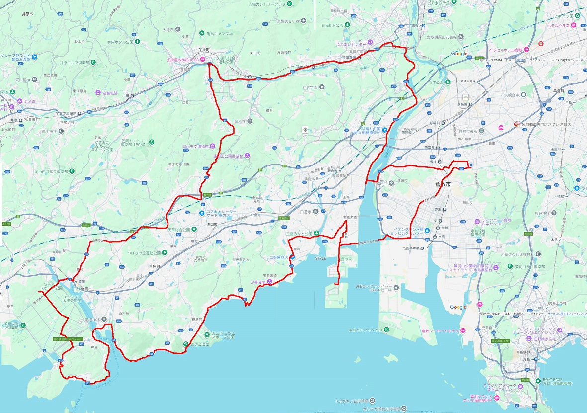 →「児島湾大橋」→コンビニ(昼食〉→(金甲山線〉→(県道399号線)→金甲山(展望所)→(飽浦東児線)