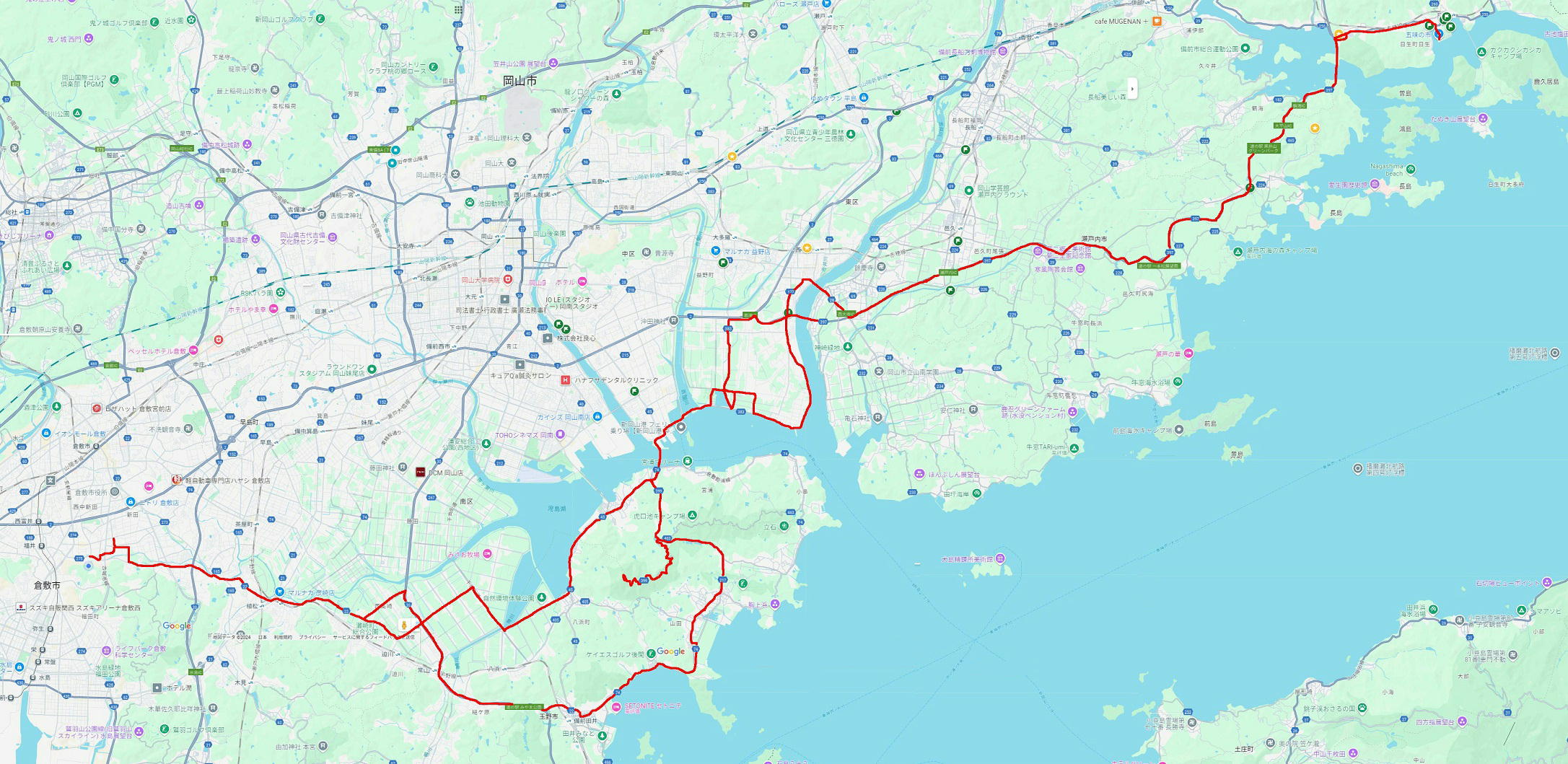 国道2号線で行けば近いのですが、玉島市経由で児島湾大橋を使って行きたいと思います。