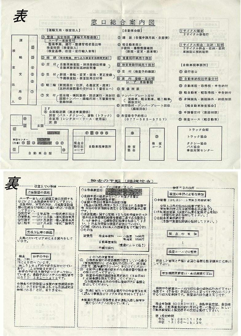 車検を受ける前に検査場の下見をしておくといいでしょう。 その際、事務所で資料がもらえます。(参照↓) |
